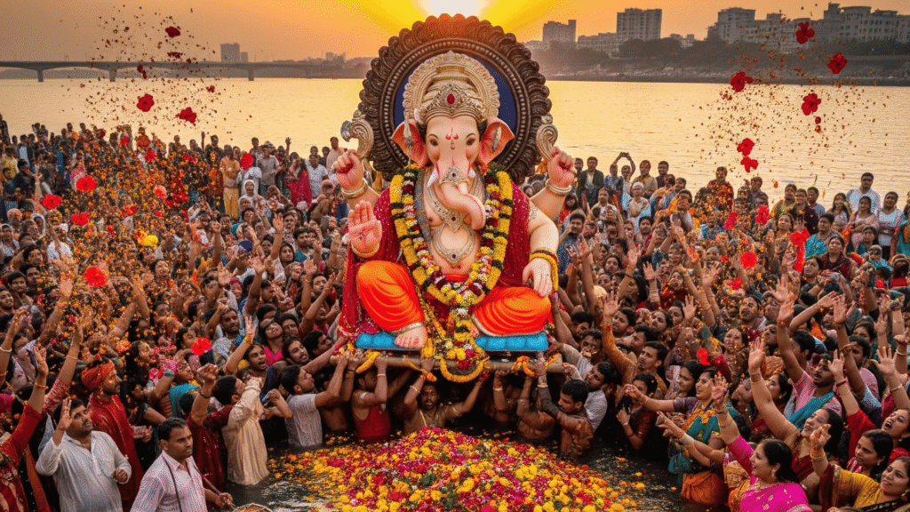Before the immersion (visarjan), a final puja is performed for Lord Ganesha, known as “Uttar Puja.” During this, offerings of sweets, modak, fruits, and flowers are made to the deity. Devotees thank Lord Ganesha for coming into their homes and pray for his return the following year. The family and community gather to sing the aarti, preparing to bid farewell to the Lord.