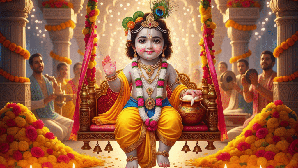 - Decorating the Home or Temple – Clean and adorn the idol of Bal Gopal (child form of Krishna), arrange a decorated swing (jhula), colorful garlands, lamps, etc.