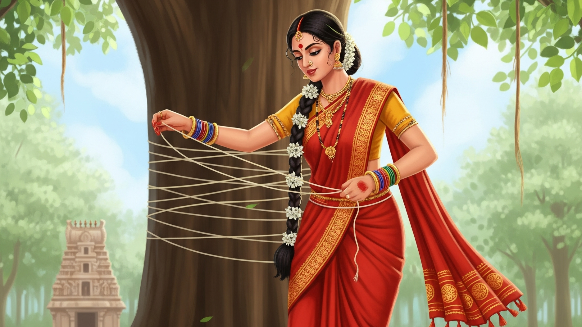 Circumambulate the tree 7 or 108 times while tying a raw cotton thread (mouli) around its trunk. This represents the unbreakable bond between husband and wife.