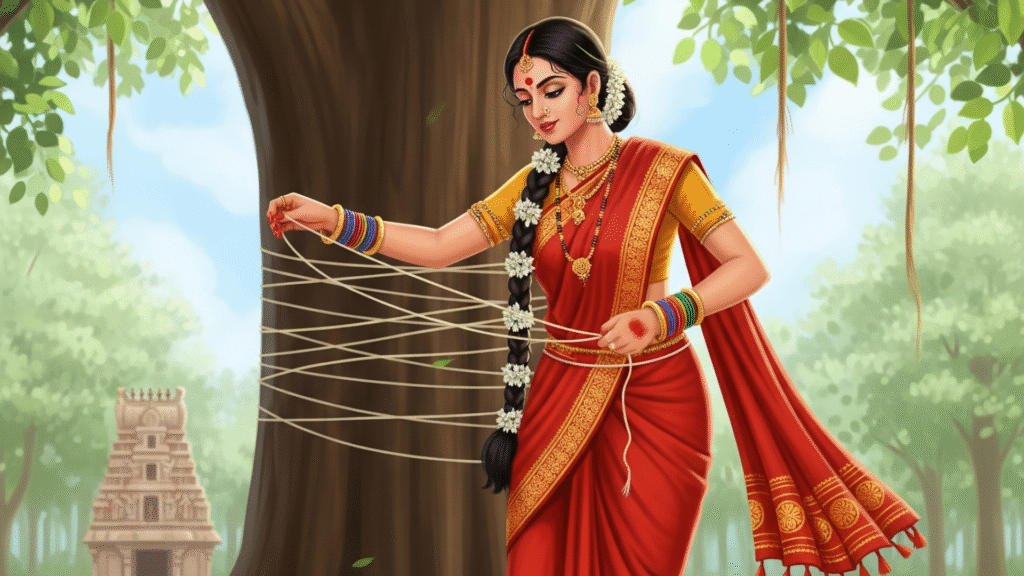 Circumambulate the tree 7 or 108 times while tying a raw cotton thread (mouli) around its trunk. This represents the unbreakable bond between husband and wife.