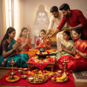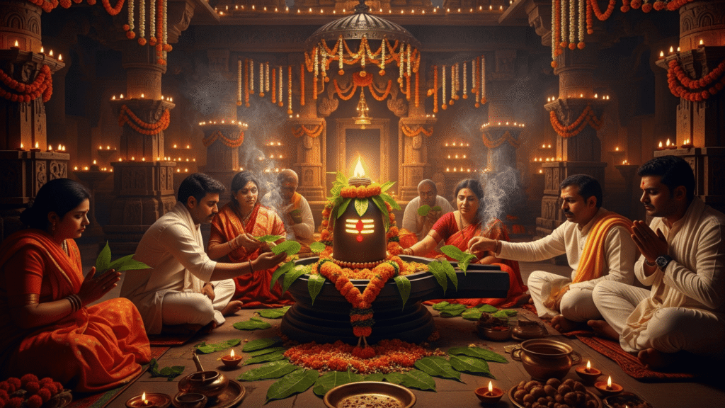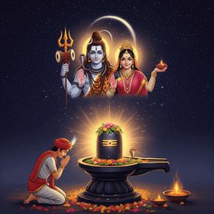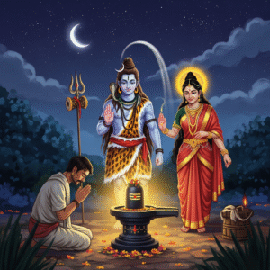उसी पेड़ के नीचे एक शिवलिंग था, जो पत्तियों से ढके होने के कारण नहीं दिख रहा था। कर्ज चुकाने और परिवार के लिए खाना लाने की चिंता में व्याकुल शिकारी चित्रभानु पेड़ पर बैठे-बैठे बेलपत्र को तोड़-तोड़ कर नीचे गिराये जा रहा था।