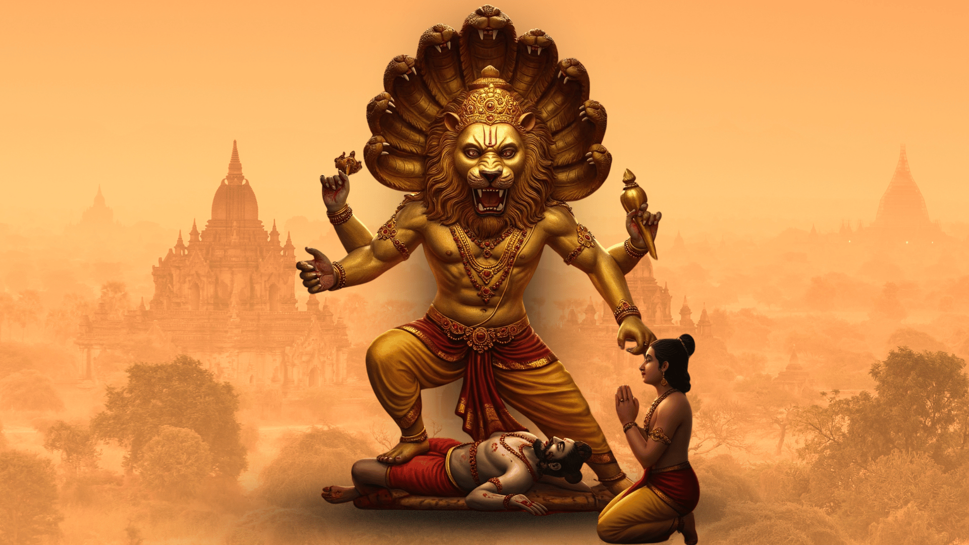 तभी स्तंभ फटा और भगवान विष्णु नरसिंह रूप में प्रकट हुए। उन्होंने हिरण्यकश्यप को संध्या के समय, दहलीज पर, अपनी गोद में रखकर, नाखूनों से वध कर दिया।