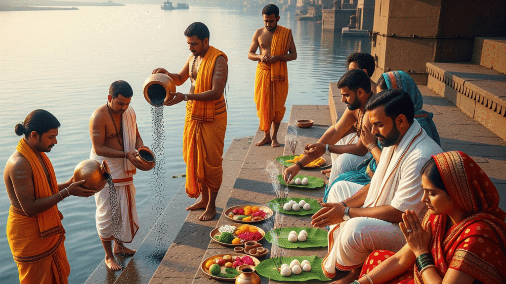- तर्पण विधि: पितरों के लिए तर्पण करना एक महत्वपूर्ण हिस्सा है, जिसमें जल, आहूति, और तर्पण सामग्री का उपयोग किया जाता है।